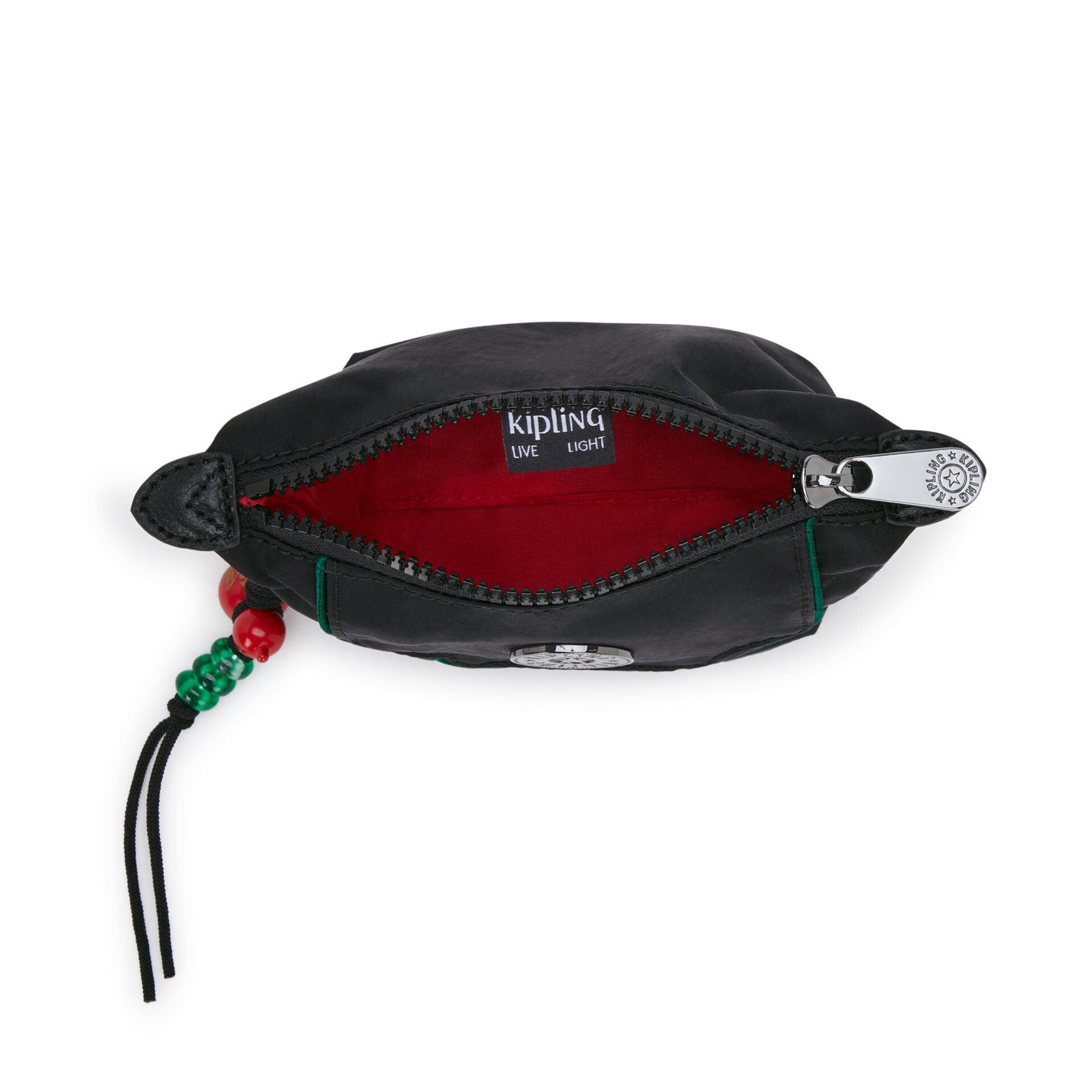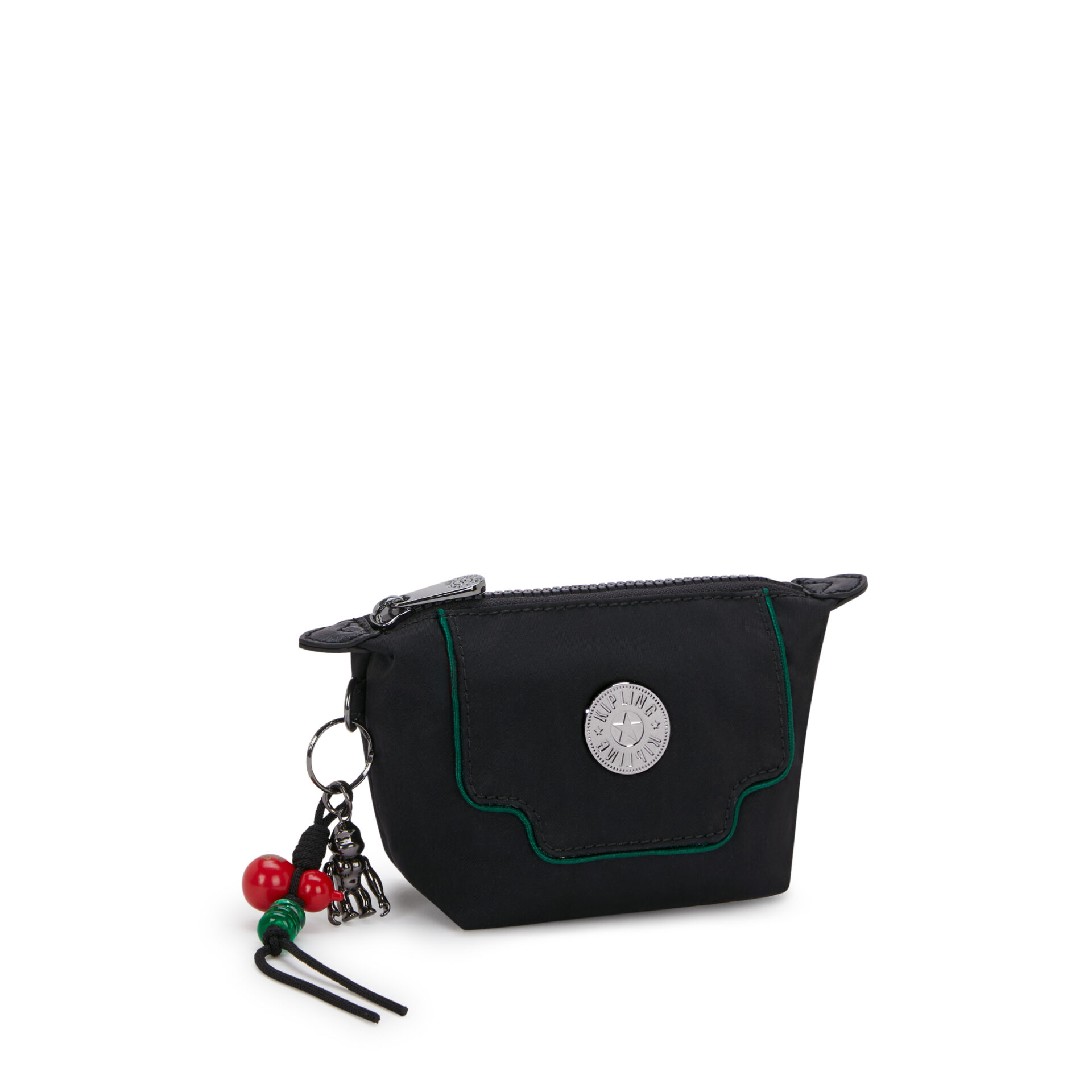 The Art Pouch Mini from the Lunar New Year collection brings festive elegance with refined details. Framed with satin piping inspired by classic Chinese garden designs and accented with green for a fresh, seasonal touch. Finished with sleek hardware and Kipling’s metallic logo, this compact pouch is both practical and elegant. The signature robot monkey charm and lucky red gourd with jade beads add a festive flourish, making the Art Pouch Mini perfect for celebrations or gifting.1 main zipped compartment