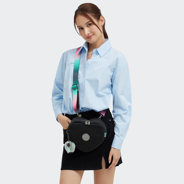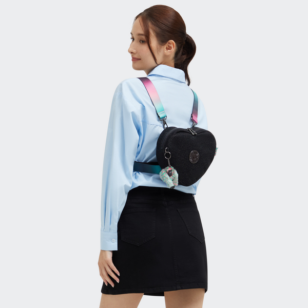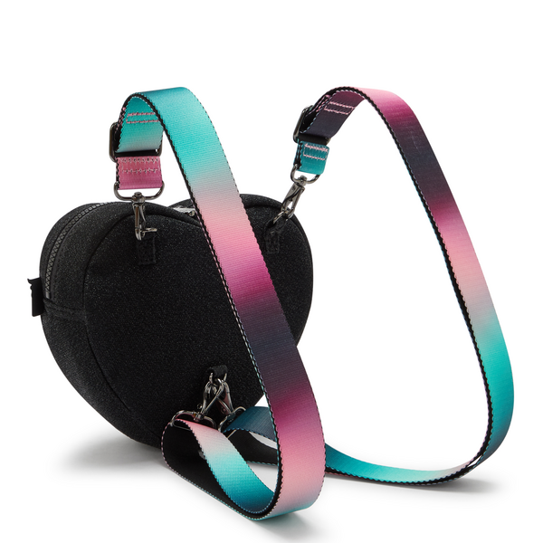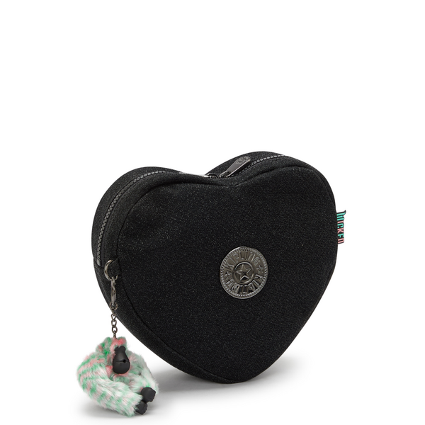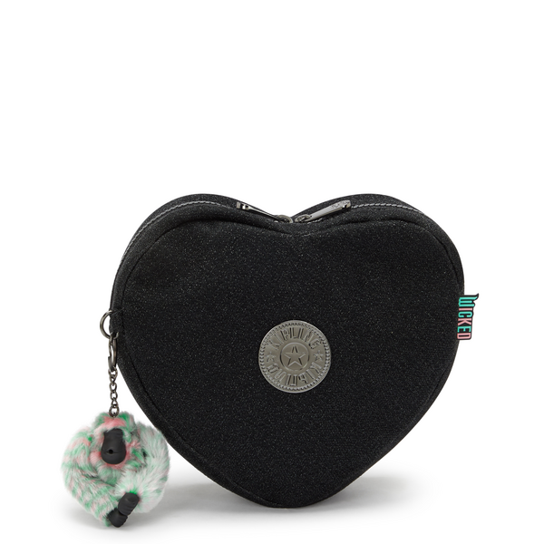 Get ready to defy gravity with this convertible bag! Wear this heart-shaped beauty as a backpack, shoulder bag, or crossbody. Elevate your outfit with the black glitter fabric and gun metal logo. Make sure to add the “Wicked” monkey keychain to your collection too!